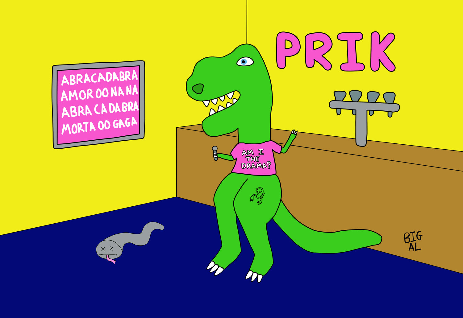 This artwork was created as birthday gift between friends. The dinosaur (birthday boy) is singing a Lady Gaga song in an Amsterdam bar they both love. The dinosuar is wearing a T-Shirt which says 'Am I the Drama?' whilst sporting a Scorpion Tattoo. There is also a dead snake on the floor! An in joke, I did not ask questions!