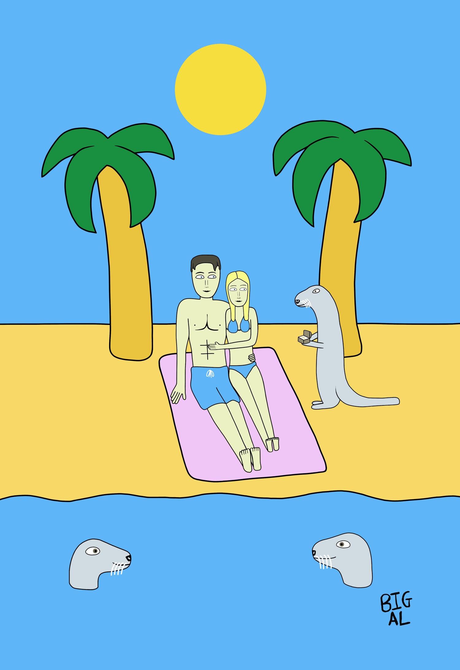This artwork was created as part of an engagement proposal! The happy couple are laying on a beach surrounded by Otters (their favourite animal) with one Otter holding out an engagement ring!