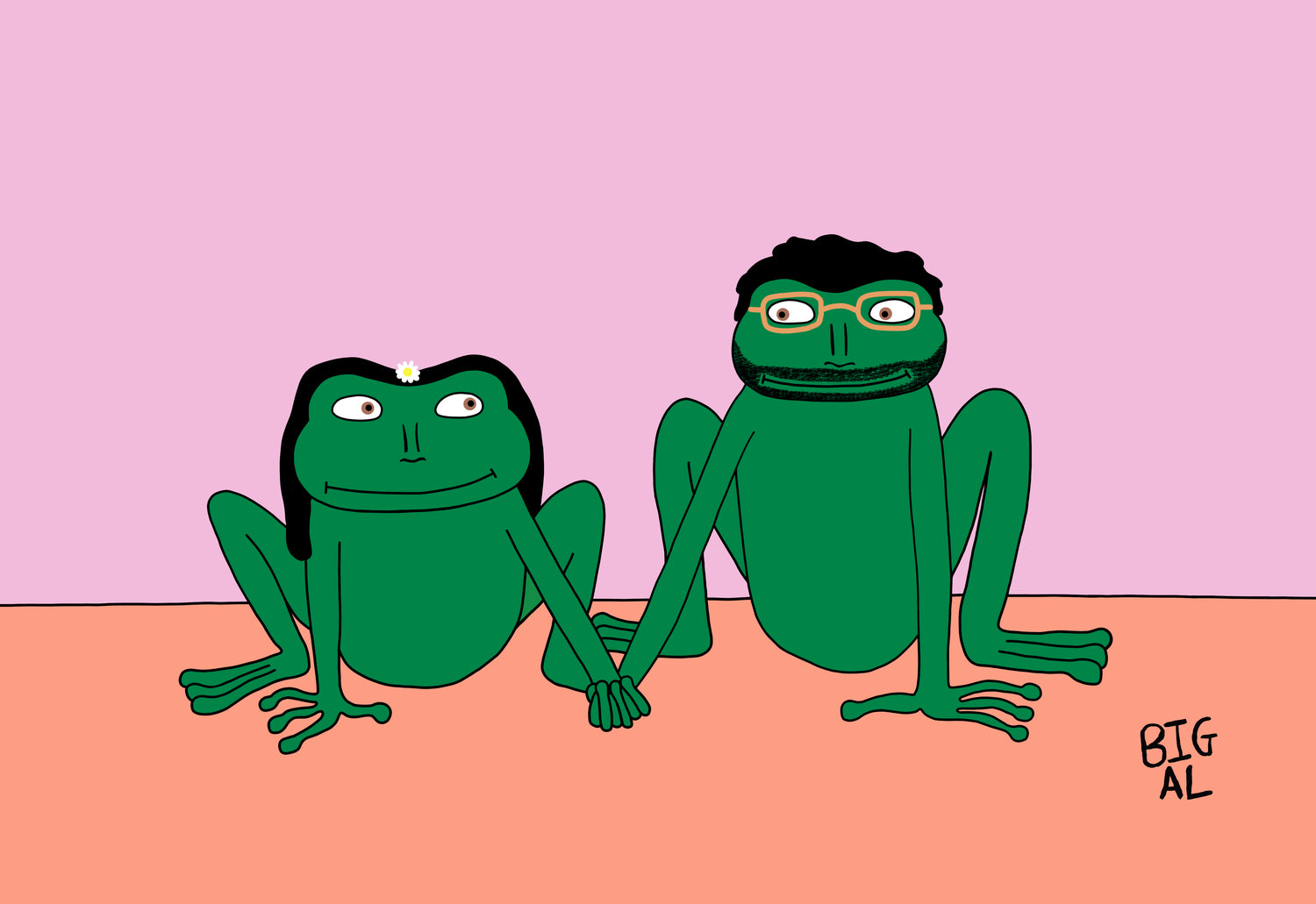 This artwork was created as gift from one partner to another. Both are OBSESSED with frogs. Here they are, as frogs themselves, holding hands and looking lovingly into each others eyes.