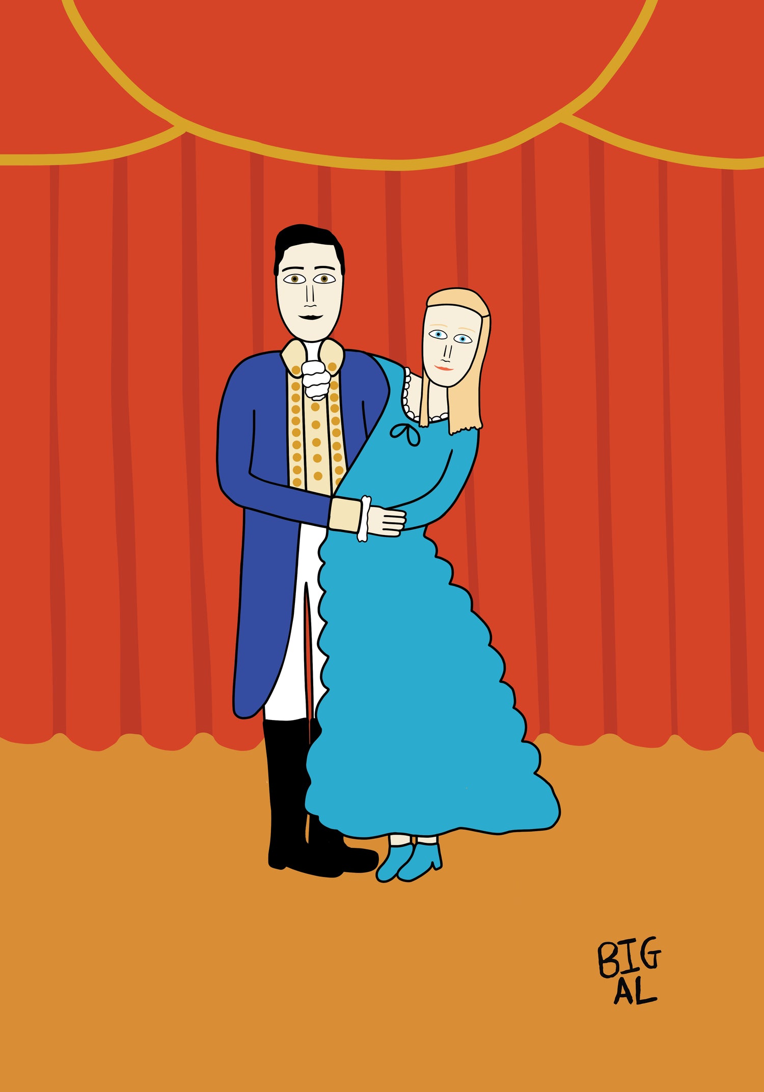 This artwork was created as a wedding gift for a couple. They both work in and LOVE theatre. Here they are treading the boards as one of theatres most iconic couple; Alexander and Eliza Hamilton (Hamilton)